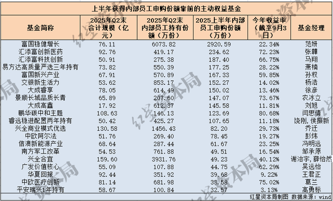 红星资本局注意到,上半年,基金赚钱效应凸显,范妍、张韡、闫思倩等基金经理在管产品获得自家员工积极申购。其中,范妍管理的富国稳健增长去年下半年就获内部员工大幅增持超3000万份份额,今年上半年又获得增持超2900万份。