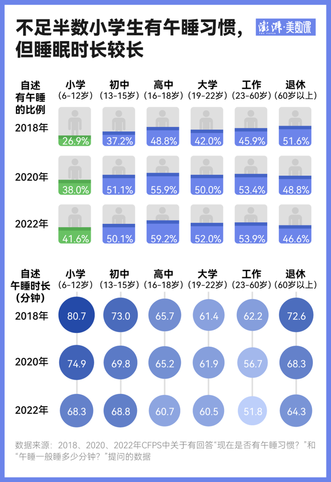 到了高中阶段,情况就明显不同了,有午睡习惯的比例更高。甚至,在2022年的CFPS调研数据中,有午睡习惯的高中生比例还排在了全年龄段的首位。