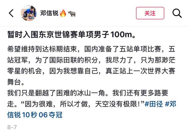 在赢下全国锦标赛男子百米金牌之后,邓信锐在自己的社交账号上写下这段激励自己的话。