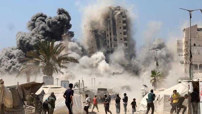 法新社的视频显示,坐落在加沙城拉马勒(Al-Rimal)街区的穆什塔哈大厦(Mushtaha Tower)底层发生大规模爆炸后,整栋大厦轰然倒下,激起漫天沙尘。