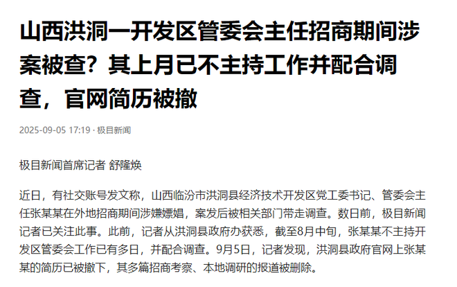 截至8月中旬,张姓官员已经不主持开发区管委会工作已有多日了,并在配合调查中。9月5日,记者发现,洪洞县政府官网上张姓官员的简历已被撤下,其多篇招商考察、本地调研的报道均被删除。