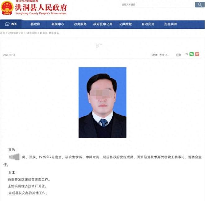 公开信息显示,张姓官员1975年7月出生于山西洪洞,大学学历,1999年12月参加工作后始终在洪洞县任职,从乡镇科员起步,逐步晋升为镇长、镇党委书记、副县长。2021年,他调任洪洞经济技术开发区负责人,明确为正处级(正县级)领导职务。任职期间,他曾多次带领团队前往上海、江苏、江西等地开展招商考察,是开发区招商引资、项目建设等核心工作的主要负责人。
