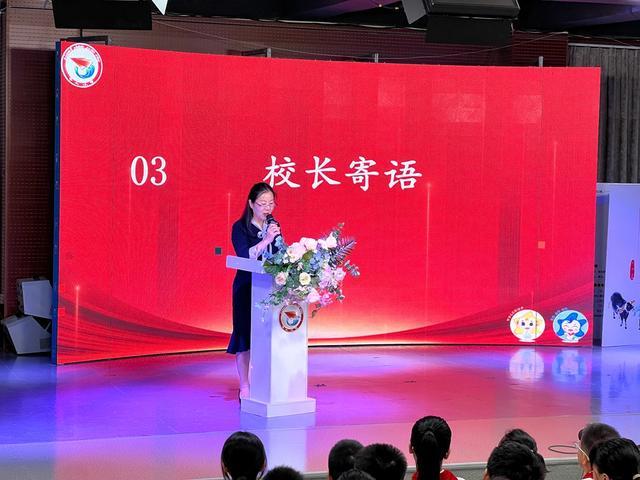 德育主任弓程老师为同学们送上新学期提醒与嘱托。随后,刘校长登台分享,为师生们加油鼓劲。典礼还对暑期表现优异的个人与集体进行表彰:王校长、高校长、郭主任为任宛清等22名“暑期光明使者”颁奖;李书记为二一中队等5个“暑期能量班级”班主任颁奖;河南商报记者范老师为陈霏霏同学及辅导老师胡玉肖颁奖,陈霏霏的习作已刊发并获20元稿费;河南惠济经济开发区综合办公室副主任张东旻、迎宾路街道党工委委员王桂香、林语溪岸社区党支部书记宋雅青为徐梓睿等10名“社区最美小读者”颁奖。