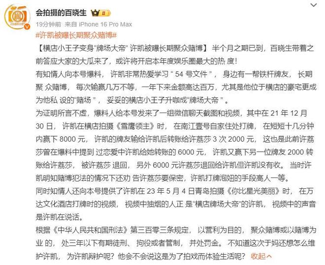近期,演员许凯的负面传闻接连不断,从先前被曝情感不端、“诋毁”同事,到近日又有全新爆料直指其长期参与聚众赌博,相关聊天记录、视频等证据在网络传播,不仅让他本人深陷舆论漩涡,也再度引发公众对娱乐圈艺人德行与法律意识的讨论。
