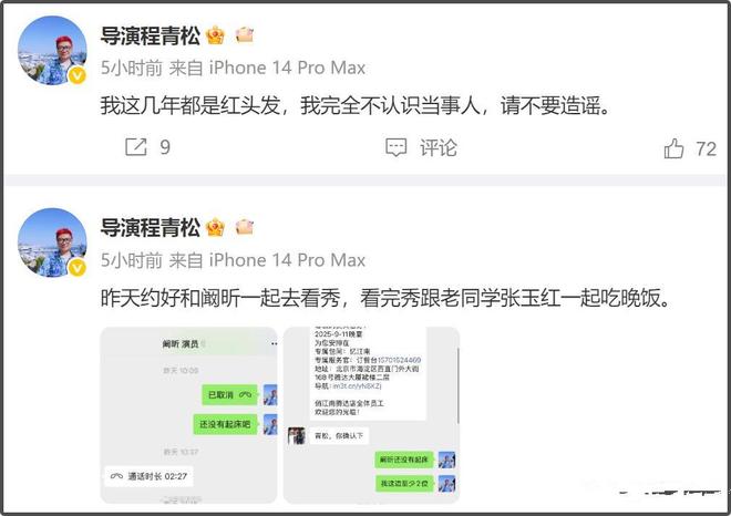 从流传的现场照片来看,事发楼下除了警方人员,还有两名男子,一人站立一人坐着,站着的黑衣男子正拉着白衣男子的手,动作似在安慰。正是这张照片,让网友开始对两人身份展开猜测。不少人根据站着的黑衣男子侧脸,认为其疑似导演程青松,随后在网络上开启质问模式。面对突如其来的质疑,程青松在半夜连续发布多条博文澄清,晒出自己事发当天的活动照片用以证明自己不在场,同时强调自己多年来一直是红色头发,与照片中黑衣黑发的男子形象完全不符,还明确表示自己并不认识于朦胧。到了次日凌晨四点,程青松再次发文,称已就此事报警处理,希望通过法律途径维护自身权益。