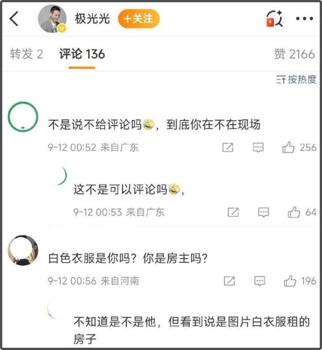另一边,坐着的白衣男子则被网友指向编剧极光光。网友找出极光光此前发布的一条文案为“八月”的博文,其中有一张他穿着白色短袖的自拍,从发型、穿搭风格来看,与照片中的白衣男子有相似之处。更受关注的是,这张自拍的背景露出了部分室内装修,身后窗户的格局与网传事发地窗户的格局高度相似,且从装修痕迹判断,其家中似乎处于刚装修完的状态,这些细节进一步加深了网友的怀疑。不同于程青松的主动澄清,极光光对此没有任何公开回应,只是默默删除了相关博文,并关闭了个人账号的评论区,这种沉默的处理方式引发了更多争议,不少网友直言“删博关评反而显得心虚,有问题就该说清楚”。