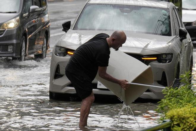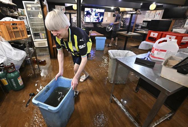 9月11日,日本东京品川区,受强降雨影响,一家餐馆被洪水淹没,员工们正忙着用垃圾桶舀水。
