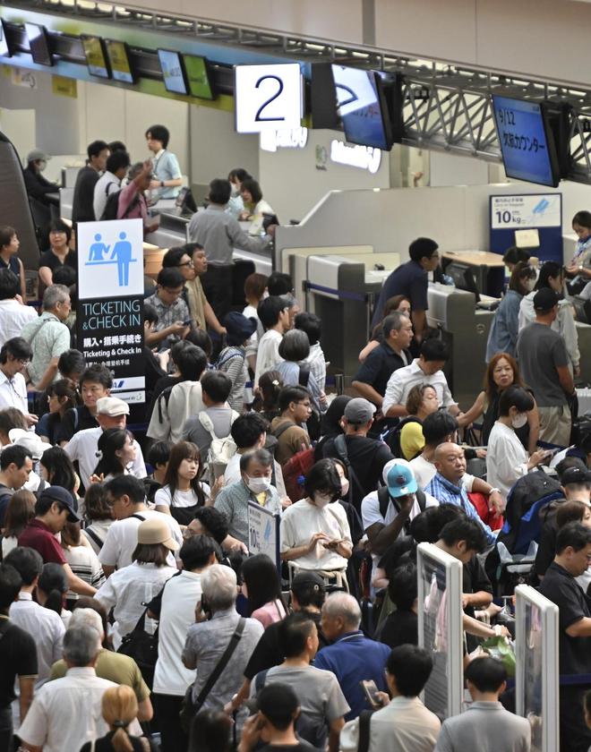 9月12日,日本东京羽田机场,旅客在柜台前排队办理手续,机场内人头攒动。