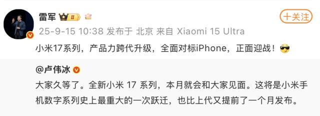 9月15日,小米集团董事长兼CEO雷军通过个人微博表示,小米17系列产品力将跨代升级,全面对标iPhone,正面迎战!
