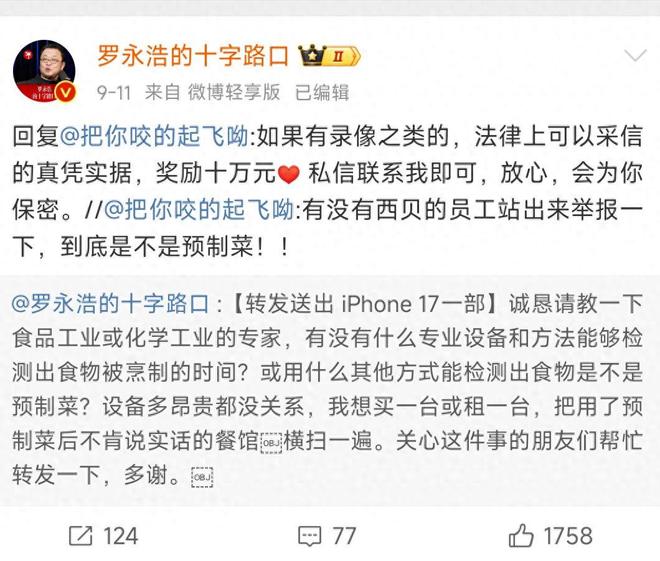 罗永浩与西贝之争新进展:罗永浩将兑现10万悬赏金,赏金对象曝出