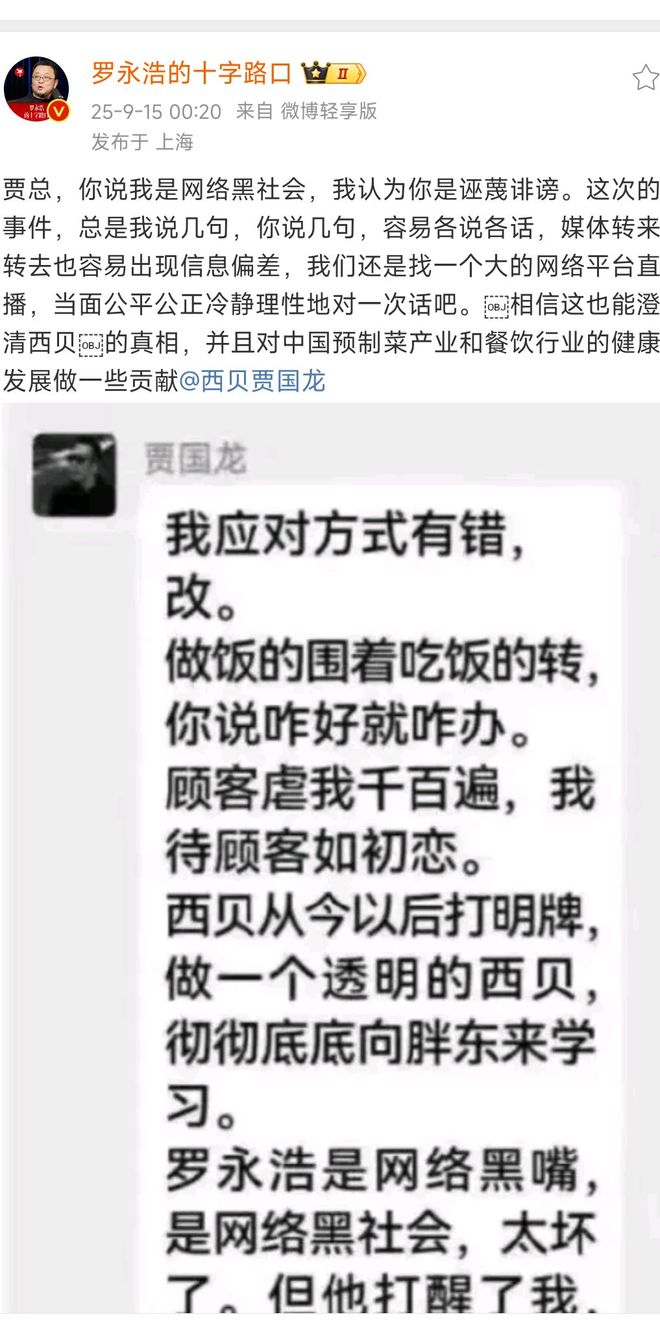 就在外界以为争议会持续升级时,9月13日,罗永浩却突然表示将暂停对此事的讨论,称自己“需要投入精力处理其他正事”,不少网友当时判断这场对峙可能就此“停战”。但事情的走向并未如预期般平静,9月14日,一张标注为西贝创始人贾国龙评价罗永浩为“网络黑嘴”的截图在网络上流传,这一评价直接打破了短暂的平静,罗永浩再度作出回应,直言要与贾国龙就此事继续对峙。