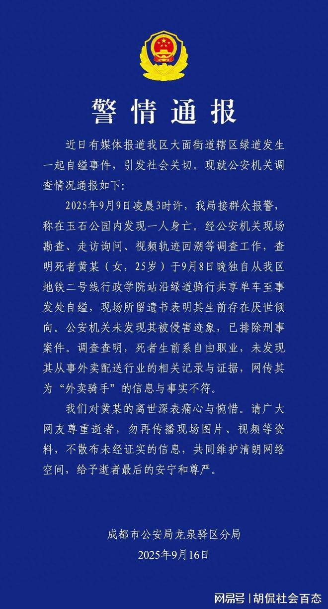 9月8日晚,黄某独自一人从龙泉驿区地铁二号线行政学院站出发,沿绿道骑着共享单车前往事发公园,最终在那里自缢。现场留下的遗书明确显示,她生前已有厌世倾向。公安机关介入调查后,很快查清了她的身份,同时排除了被侵害的迹象,确定这不是刑事案件。调查还特别澄清,黄某生前是自由职业者,未找到她从事外卖配送行业的任何记录或证据,此前网传“她是外卖骑手”的说法与事实不符。