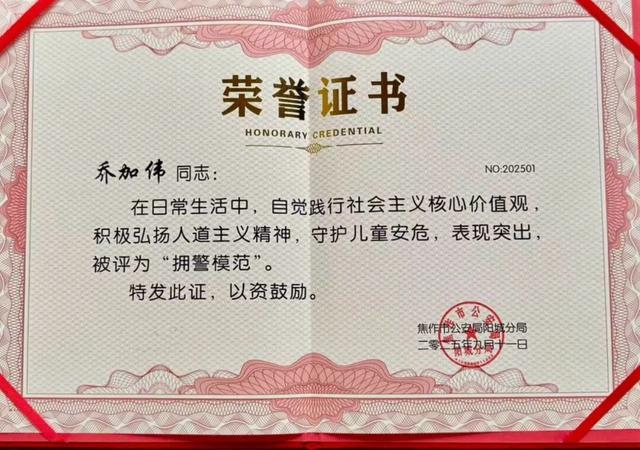 焦作市公安局阳城分局获悉此事后,专程为乔加伟颁发荣誉证书,表彰其“守护儿童安危,弘扬社会正气”的行为,并授予他“拥警模范”称号。警方呼吁更多市民以乔加伟为榜样,共同营造温暖和谐的社会环境。