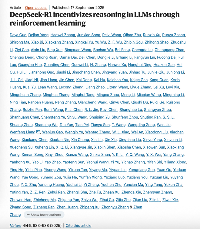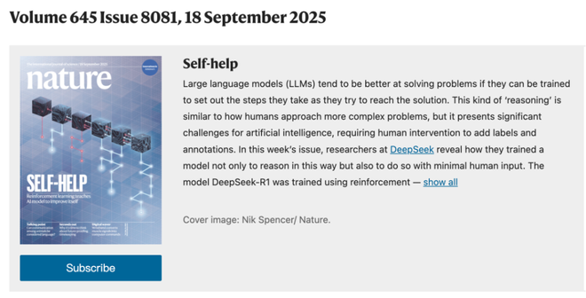 9月18日,梁文锋作为通讯作者,带着DeepSeek-R1的研究,登上最新一期国际顶级期刊《自然》(Nature)封面。