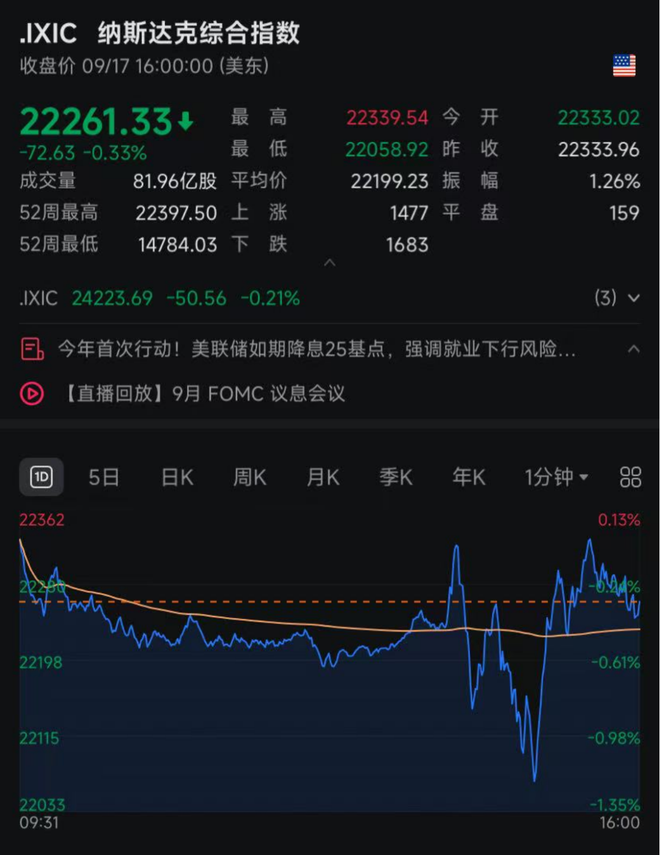 美联储宣布降息之后,市场反应剧烈。美股三大指数一度直线拉升,随后跳水。鲍威尔在随后的新闻发布会上称,今天的降息举措是一项风险管理决策,没有必要快速调整利率。这意味着美联储并不会进入持续性的降息周期,市场情绪因此降温,纳指盘中一度跌逾1%。