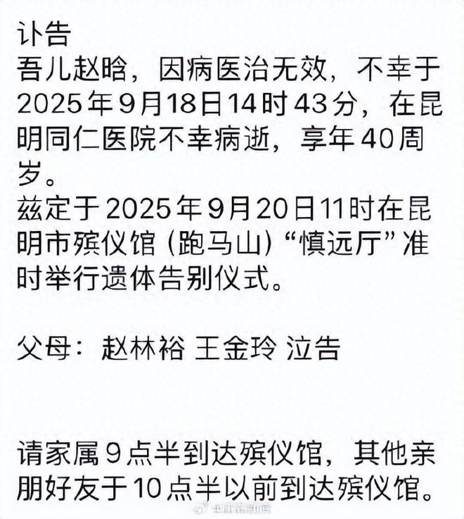 讣告中明确了后续事宜安排:赵晗的遗体告别仪式定于2025年9月20日11时,在昆明市殡仪馆(跑马山)的“慎远厅”举行。家属特别恳请亲友能在当日10点半前抵达,送他最后一程。9月19日,昆明市殡仪馆工作人员也向外界确认了这一消息,称已有不少人打电话咨询,相关准备工作正按计划推进。