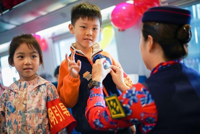 活动正式开始,“文明引导员”招募环节瞬间点燃现场气氛。列车长手持话筒热情号召:“哪位旅客愿意加入我们,共同倡导文明出行?”话音未落,一位年轻小伙率先举手:“我来!”紧接着,多位旅客踊跃响应。最终,一名成人和两名小朋友光荣受聘,戴上闪亮徽章,脸上洋溢着自豪。他们与铁路职工、先进代表组成流动宣传队,即刻上岗。