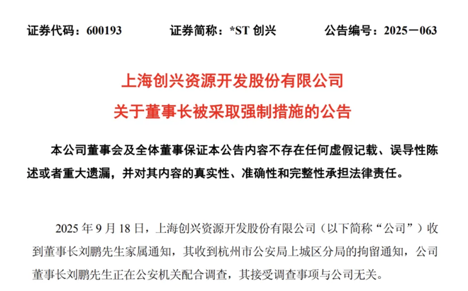 红星资本局9月19日消息,昨日晚间,创兴资源(即*ST创兴,600193.SH)发布公告称,收到公司董事长刘鹏家属通知,刘鹏已收到杭州市公安局上城区分局的拘留通知,正在公安机关配合调查。创兴资源强调,刘鹏接受调查事项与公司无关。