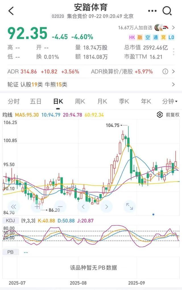 9月22日,安踏体育(02020.HK)跌4.60%报92.35港元/股,总市值蒸发125亿港元。