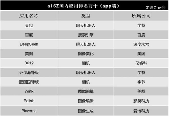 需要说明的是,其统计的是iOS和Google Play的数据,因缺少Android市场的部分应用,所以和国内榜单上的AI应用排名有所区别,比如国内榜单排名靠前的腾讯元宝、360旗下的纳米AI搜索均没有上榜,与此同时,一些“大厂老产品+AI”类应用出现在榜单前十中,比如美图在2008年推出的美图秀秀、字节在2020年推出的醒图。