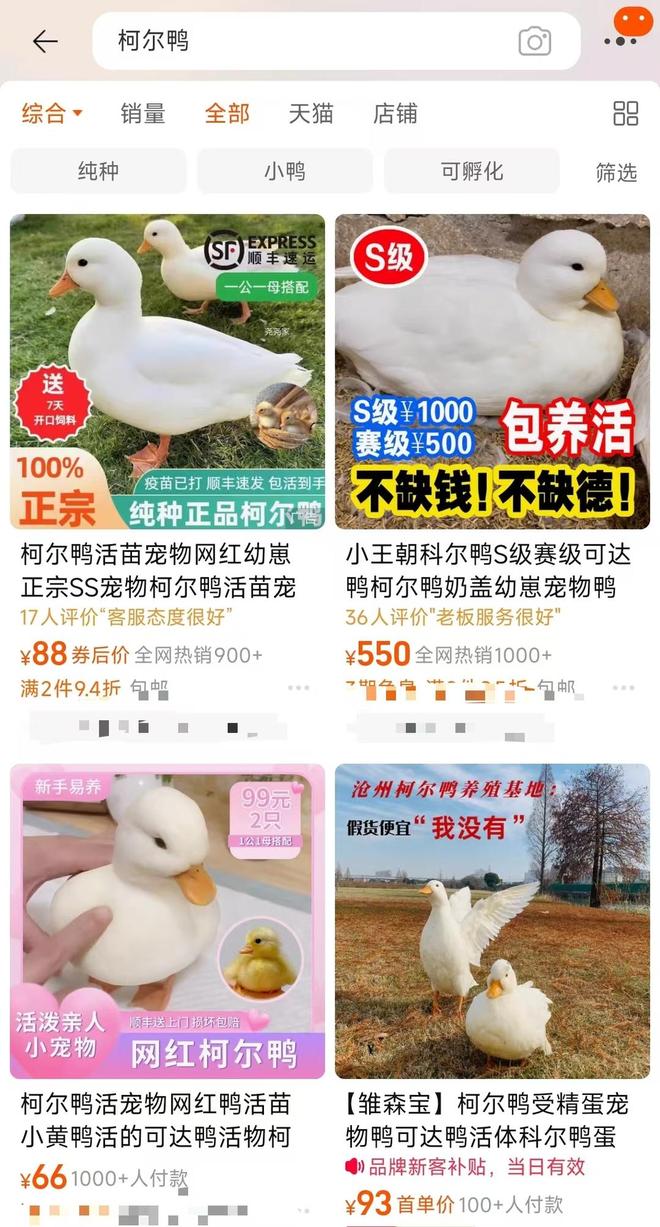 曾经身价上万元的网红宠物柯尔鸭,价格被“打”了下来。红星资本局注意到,在多个平台,仅需数百元就能买到柯尔鸭,如果选择购买柯尔鸭蛋自行孵化,价格会更低。