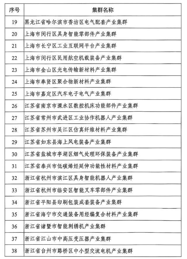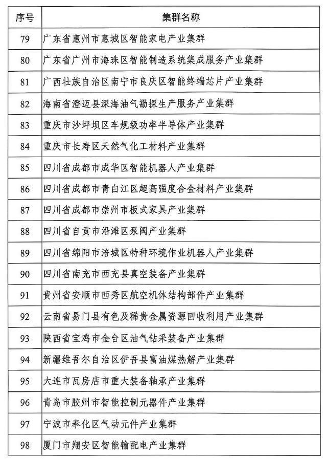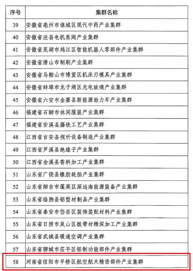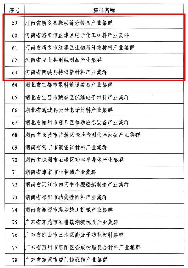 河南6个集群在列,包括:河南省信阳市平桥区航空航天精密部件产业集群、河南省新乡县振动筛分装备产业集群、河南省洛阳市孟津区电子化工材料产业集群、河南省新乡市红旗区生物基纤维材料产业集群、河南省光山县羽绒制品产业集群、河南省西峡县特钢新材料产业集群。