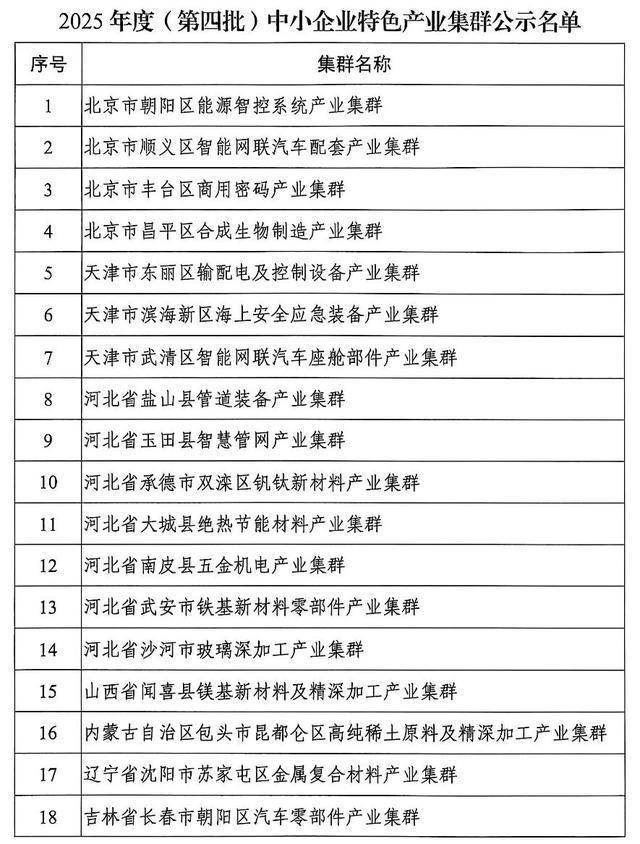 9月24日,工信部公示2025年度(第四批)中小企业特色产业集群名单。
