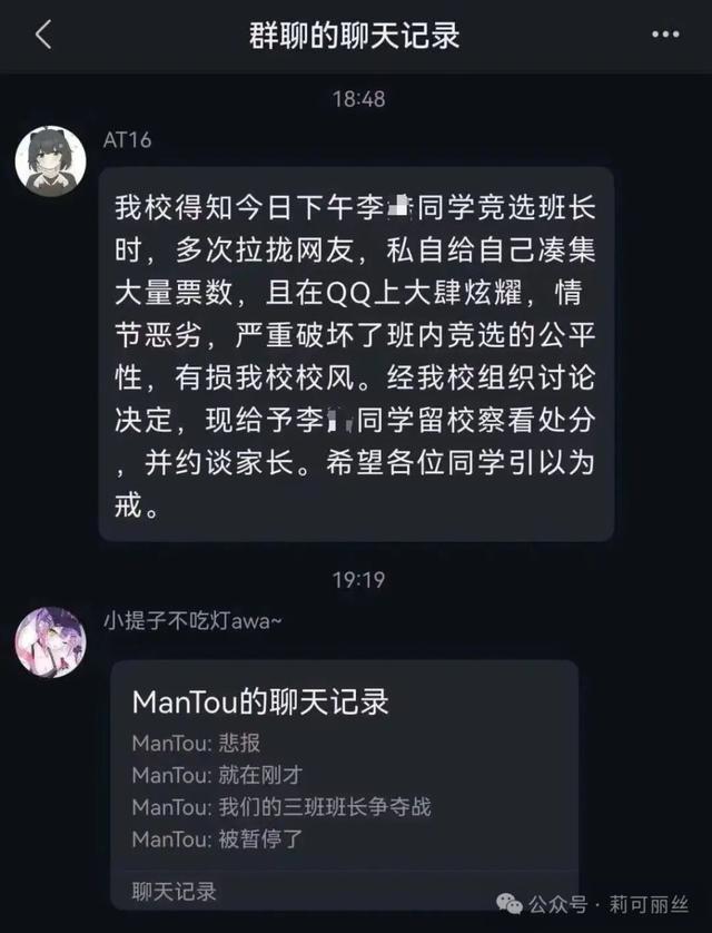 与相关网络投票截图一起传播的,还有一张所谓“给予李姓同学校内处分”的微信群聊截图与这则“三班班长”投票传闻本身“携手”传播。