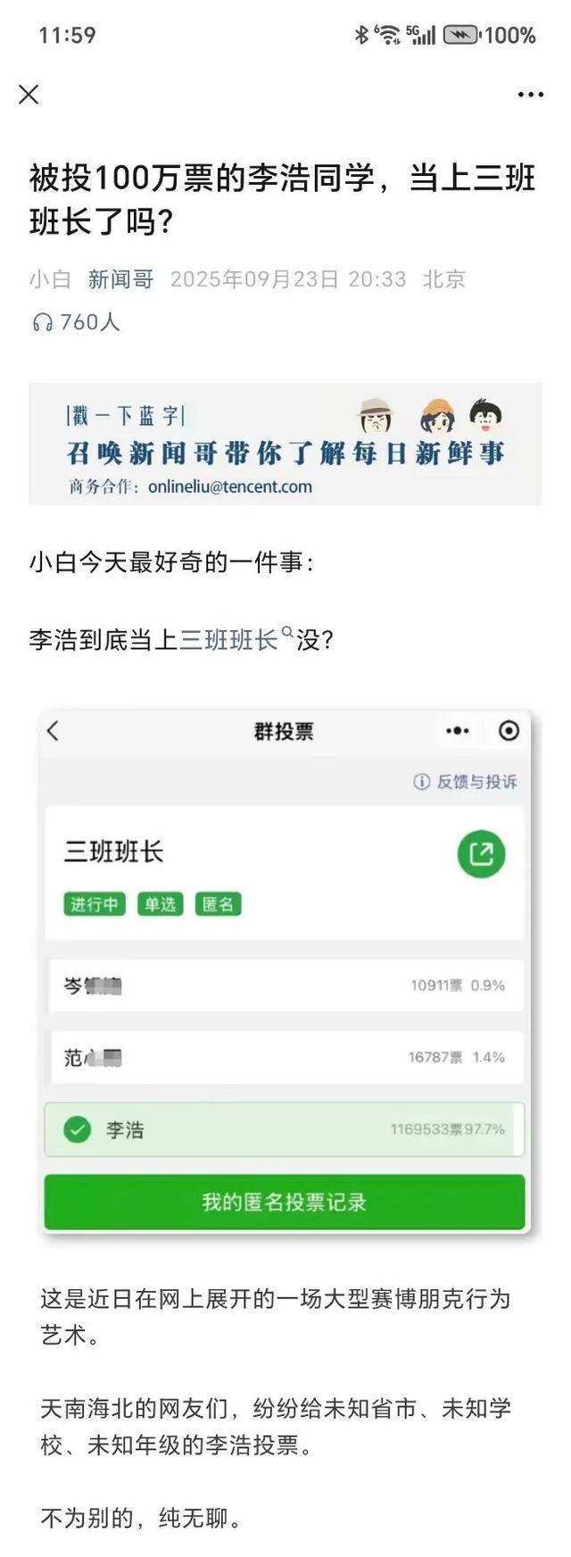 “新闻哥”在这则题为《被投100万票的李浩同学,当上三班班长了吗?》的头条推文中这样写道:“这是近日在网上展开的一场大型赛博朋克行为艺术。天南海北的网友们,纷纷给未知省市、未知学校、未知年级的李浩投票。不为别的,纯无聊。”