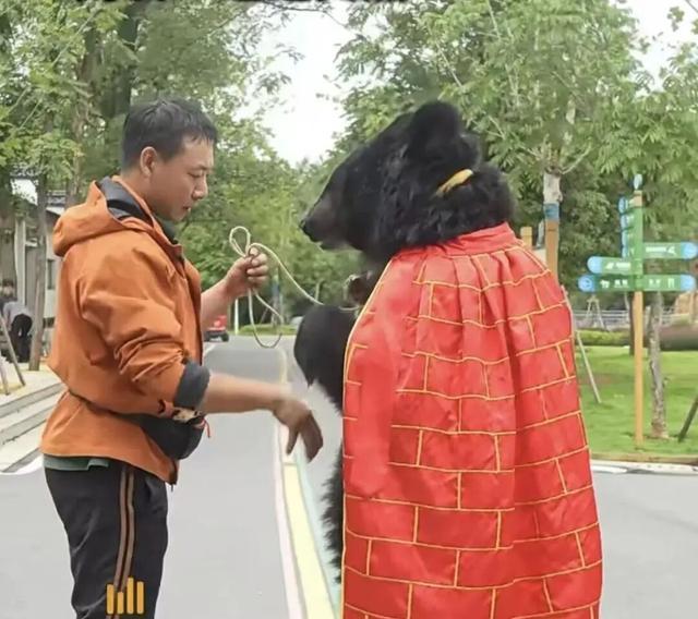 视频显示,这只黑熊身披红袈裟,能直立行走、和工作人员互动,动作拟人程度极高,引发游客质疑:“这真的不是工作人员假扮的吗?”