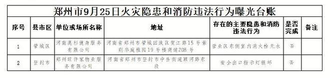9月24日,记者从郑州市消防救援支队获悉,该支队通报了9月火灾隐患和消防违法行为,涉及河南奥杉健身服务有限公司和郑州旺仟家物业服务有限公司两家单位,具体隐患包括室内消火栓无水和安全出口指示灯损坏等。