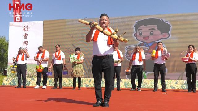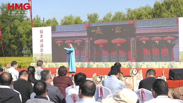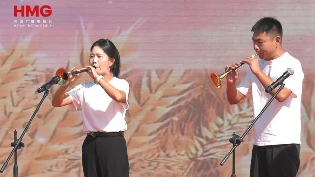 在原阳县太平镇水牛赵村的万亩稻田,《盘鼓》擂响了激昂序曲,唢呐《庆丰收》、歌伴舞《喜庆丰收年》等节目赢得阵阵掌声,太平镇12位村党支部书记身着农耕元素服饰走秀,为特色农产品代言,讲述着原阳稻田新故事。