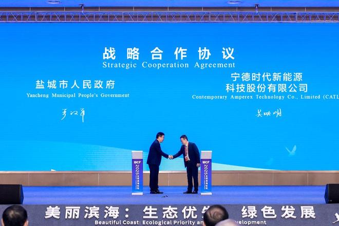 9月24日上午,在2025全球滨海论坛开幕式上,盐城市人民政府、宁德时代新能源科技股份有限公司签订战略合作协议。