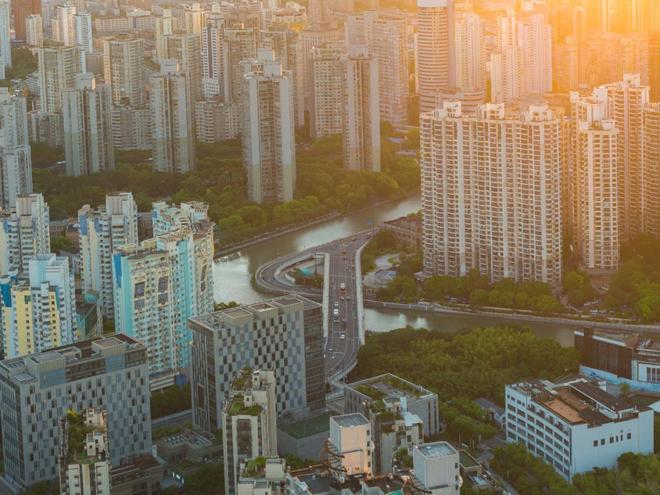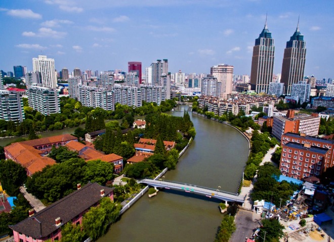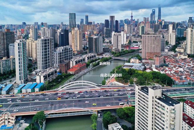 俯瞰苏州河上的南北高桥路桥及不远处的新闸桥。