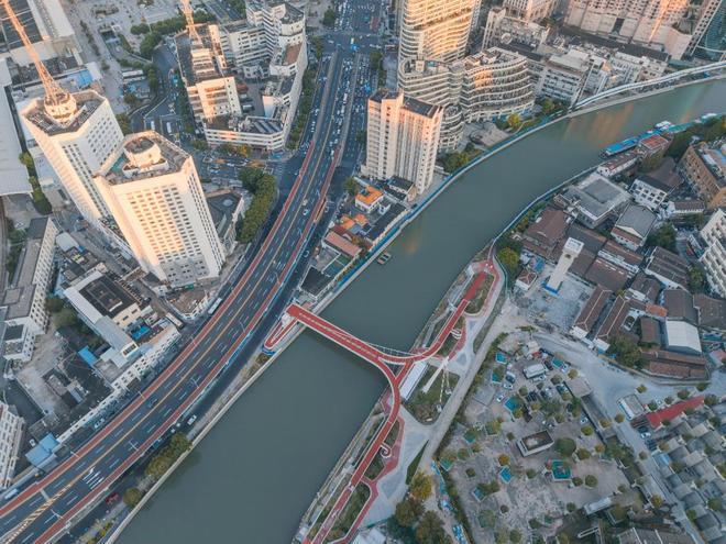 连接普陀与静安两区的苏州河首座悬索人行桥,于2025年9月开放,是苏州河上最新的一座桥梁。从空中俯瞰,百合桥呈“人”字形布局。