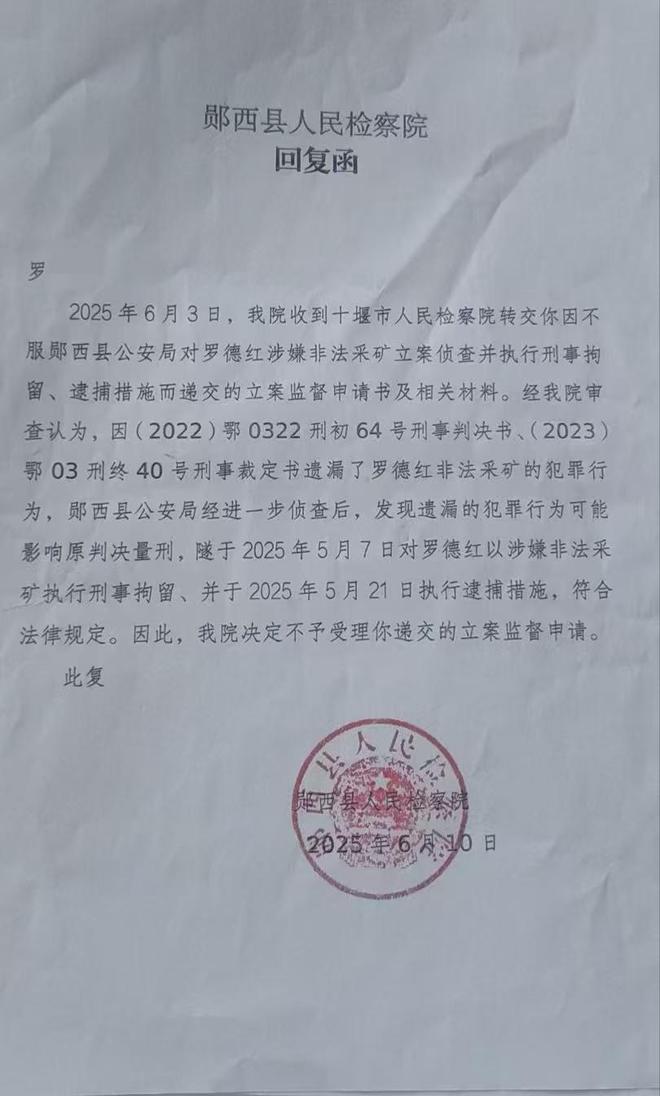 2025年3月,“罗德红非法采矿申诉案”获湖北省高院立案。同年5月,罗德红前往武汉途中再次被抓。2025年6月,郧西县检察院在一份《回复函》中称,郧西县检察院审查认为,罗德红的上述刑事判决遗漏了其非法采矿的犯罪行为,郧西县公安局经进一步侦查后,发现其遗漏的犯罪行为可能影响原判决量刑,遂于2025年5月7日对罗德红以涉嫌非法采矿罪执行刑事拘留。