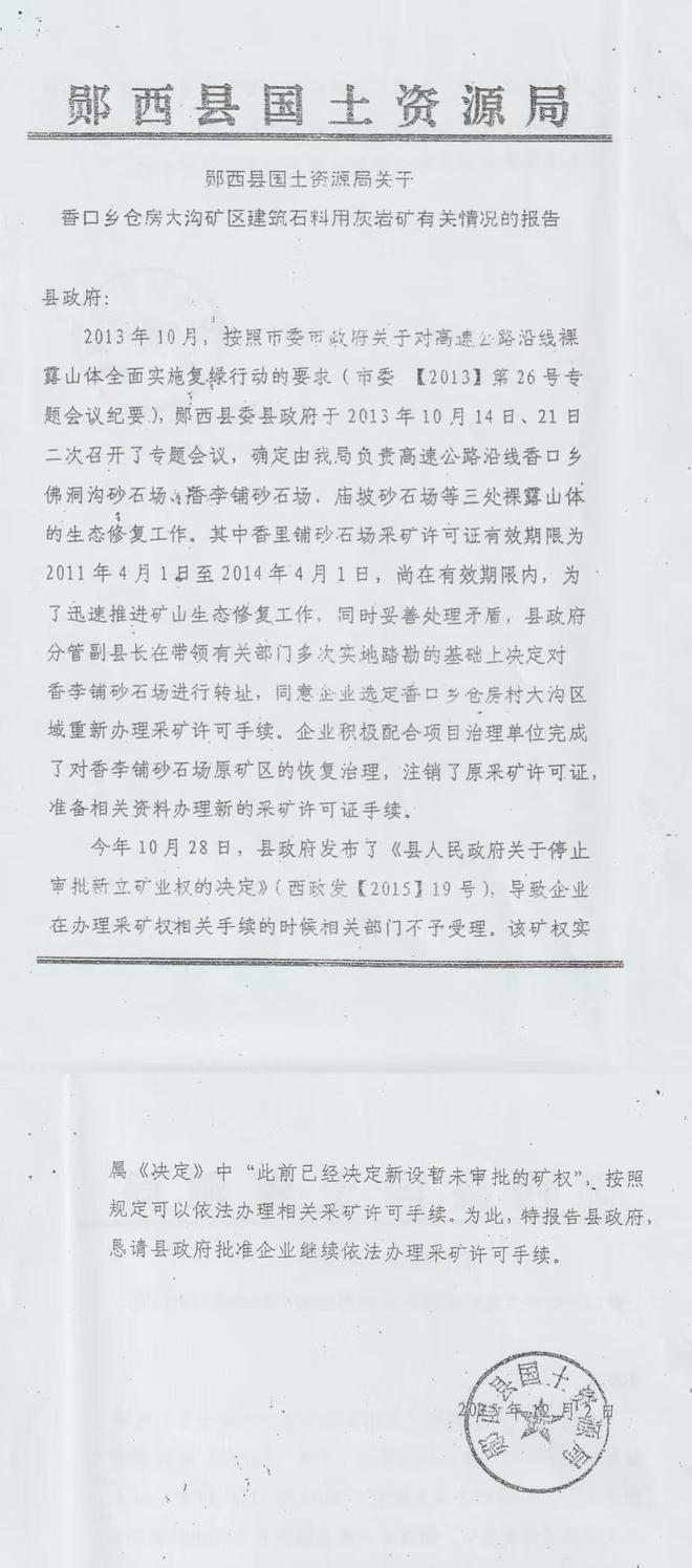 2015年12月,郧西县国土资源局在一份向县政府上报的《香口乡仓房大沟矿区建筑石料用灰岩矿有关情况的报告》称,香李铺砂石场积极配合项目治理单位完成了对香李铺砂石场原矿区的恢复治理,注销了原采矿许可证,准备相关资料办理新的采矿许可证手续。2015年10月28日,县政府发布了《县人民政府关于停止审批新立矿业权的决定》,导致企业在办理采矿权相关手续的时候相关部门不予受理。该决定中“此前已经决定新设暂未审批的矿权”,按照规定可以依法办理相关采矿许可手续。