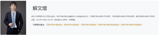 据西部利得基金网站介绍,解文增为复旦大学管理科学与工程专业博士,2022年10月加入公司。其曾任河南长葛市金融服务办公室金融办副主任、中原银行股份有限公司交易员、中原证券股份有限公司投资经理、德邦证券股份有限公司投资经理。目前在管基金有5只,为西部利得合赢债券(A/C/E)、西部利得沣睿利率债债券(A/C)。
