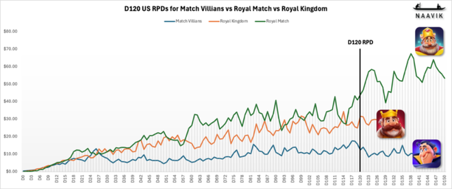 《Match Villains》的每次下载收入表现相较头部竞品仍有差距