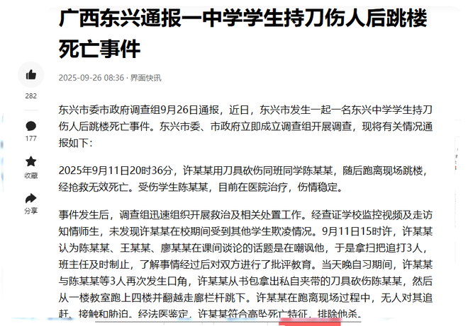 2025年9月,广西东兴市东兴中学发生的一起学生持刀伤人后跳楼事件,让两个家庭瞬间陷入悲痛,也将校园安全与青少年心理健康议题再次推至公众视野。时隔半月,当地官方调查组于9月26日发布通报,还原事件经过并回应关切,而网友的理性讨论,则从不同维度剖开了事件背后值得深思的现实问题。