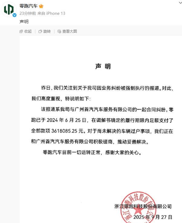 红星资本局9月27日消息 今日,针对成为失信被执行人一事,零跑汽车(09863.HK)发布声明称,关注到关于零跑因业务纠纷被强制执行的报道,系零跑与广州首汽汽车服务有限公司的一起合同纠纷。零跑已于2024年6月25日,在调解书确定的履行期限内足额支付了全部款项3618085.25元。对于尚未解决的车辆过户事项,零跑正在和广州首汽汽车服务有限公司积极磋商,推动妥善解决。零跑汽车表示,目前一切运转正常。
