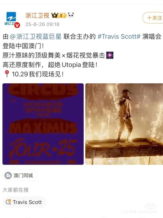 今年,甚至连电视台也来跨界主办演唱会,比如浙江卫视“蓝台”就担任了Travis Scott在中国澳门的演唱会的联合主办方。