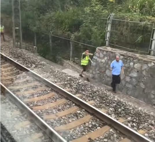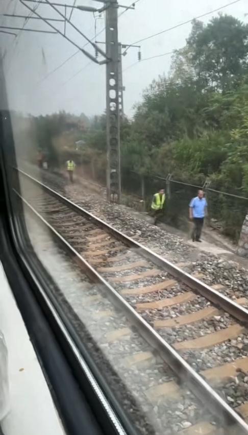 现场视频显示,列车临时停车后,通过车窗玻璃,可以看到至少4名铁路工作人员顺着一侧的轨道去查看现场。事发路段附近有铁网围住,铁网外侧就是灌木丛。