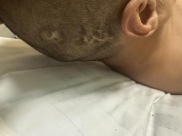 “我们现在都在医院急诊科,有3个人最严重,我没剃光头。医生检查拿手电筒照,说伤口处没有针刺。要抽血化验,每个人要打4瓶吊水,现在还在打。医生给开了止疼药,但是还是没止住痛,太疼了。”