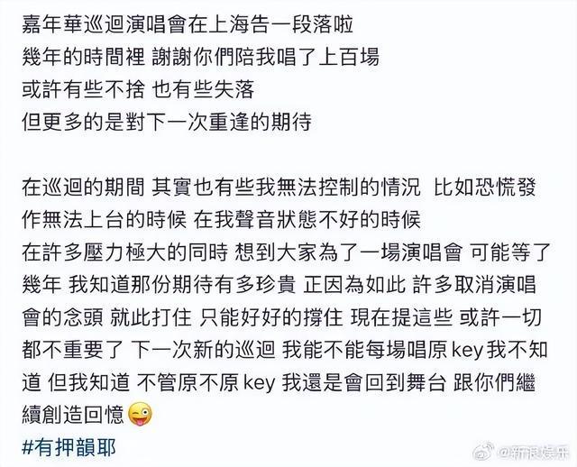周杰伦演唱会收官发文:演唱会期间也会有自己无法控制的情况,比如恐慌发作无法上台