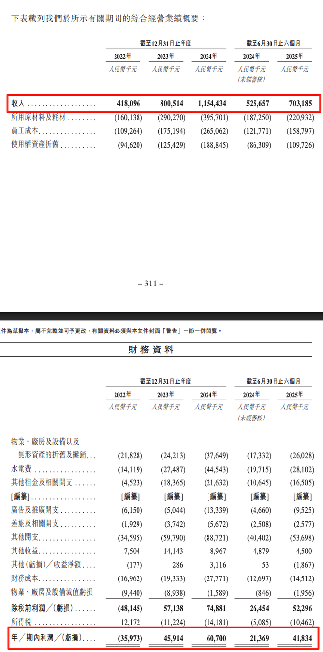 过往财务表现方面,2022年至2024年实现收入分别为4.18亿元、8.01亿元和11.54亿元,其中2023和2024年分别同比增长91.5%和44.2%。2022年利润为-3597.3万元,2023年实现扭亏为盈,年内利润为4591.4万元,2024年利润为6070万元,据计算净利同比增超三成。