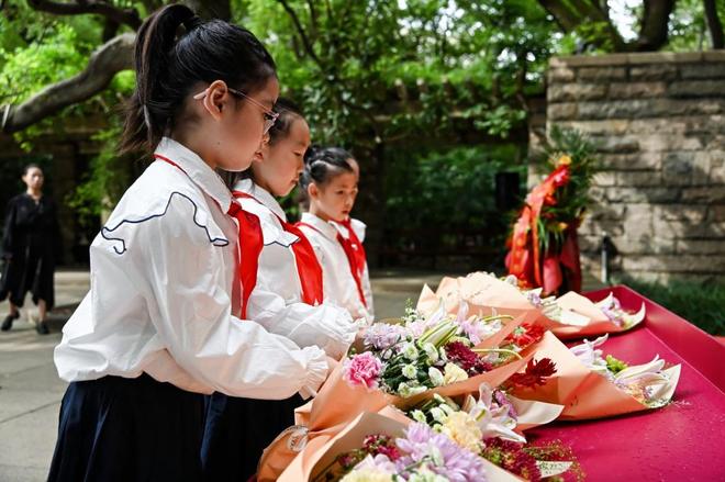 学生向鲁迅墓敬献鲜花。上海虹口 图