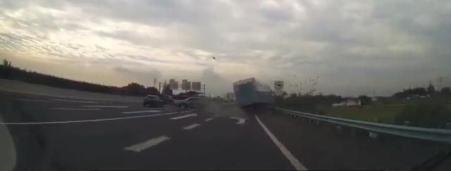 10月18日下午,一位四川网友发视频称,从蒲江到眉山高速路上,行车记录仪记录下惊险一幕:一辆大货车追尾前面一辆轿车后撞上护栏,最终翻下了路基。