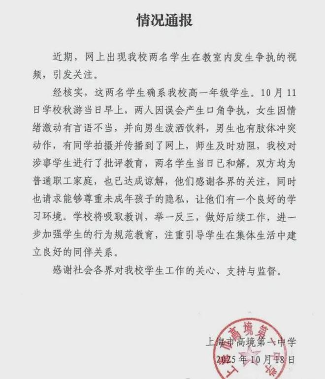 事件发酵后,涉事的上海市高境第一中学于10月18日发布了情况通报。通报里说,冲突双方都是高一年级学生,起因是“误会引发的口角争执”;关于女生口中的“父亲身份”,学校明确表示,女生和男生的父亲都是普通职工家庭,女生当时是“情绪激动、言语不当”;至于处理结果,女生被给予处分,男生被警告,两人已经达成和解。除此之外,学校还提到,有同学私下录视频并发布到网上,这个行为“侵犯了学生隐私”,希望今后不再发生,言外之意仿佛在说,校园里的事不该被外界看到,否则就是“泄露隐私”。