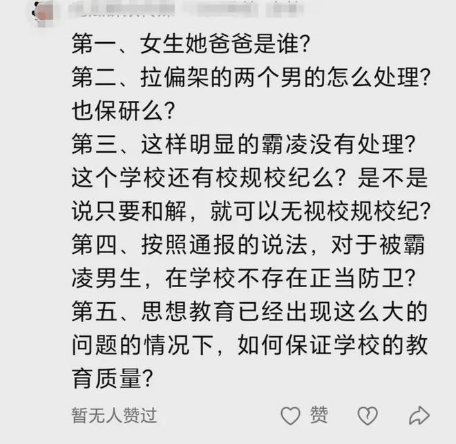 更有网友提出了“灵魂五问”,每一个问题都戳中了事件处理的模糊地带:第一,既然双方父亲都是普通职工,女生为什么会说出“你知道我爸是干什么的吗”这种话,她的嚣张底气到底来自哪里?第二,当时拉偏架的两位男同学,学校有没有对他们进行教育或处理,通报里为何只字不提?第三,女生多次主动攻击,是否构成校园霸凌,学校用“情绪激动”轻描淡写,是不是在回避“霸凌”这个核心问题?第四,男生在被反复挑衅后反击,为何被认定为“互殴”,校规校纪对“互殴”和“正当防卫”的界定标准是什么?第五,仅仅靠“和解”和轻量级的处分、警告,能真正起到警示作用吗?未来如何避免类似的冲突发生?